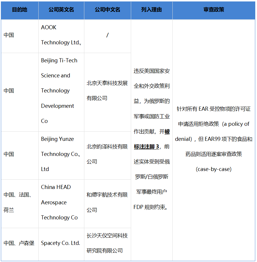 BIS以支持俄罗斯国防工业部门以及相关战争活动等为由,宣布将89个条目下的86个实体(一些实体在多个国家/地区运营)列入实体清单。前述86个实体中,79个被列入俄罗斯目的地项下、5个被列入中国目的地项下、2个被列入加拿大目的项下,前述实体为中国和俄罗斯实体的子公司。