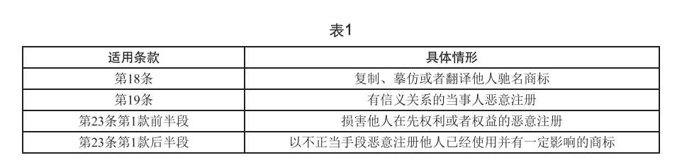就商标恶意注册申请的类型而言,《征求意见稿》第22条作了列举,所列第4项系故意损害他人合法权利或权益,谋取不正当利益的恶意注册,涵盖第18条、第19条和第23条所规定的情形。其中,第23条包括损害他人在先权利或权益的恶意注册(第1款前半段)和以不正当手段抢先注册他人已经使用并有一定影响的商标(第1款后半段)(详见表1)。按照《征求意见稿》的规定,强制移转制度适用于违反第18条、第19条和第23条第1款后半段的恶意注册。相比于《巴黎公约》和大部分国家将适用范围限定在代理人或代表人恶意注册的情形,《征求意见稿》所规定的适用范围更为广泛。至于为何将适用范围作如此规定,《关于征求意见稿的说明》未作解释。应该说,上述适用范围是否合理,有无调整的必要,值得探讨。
