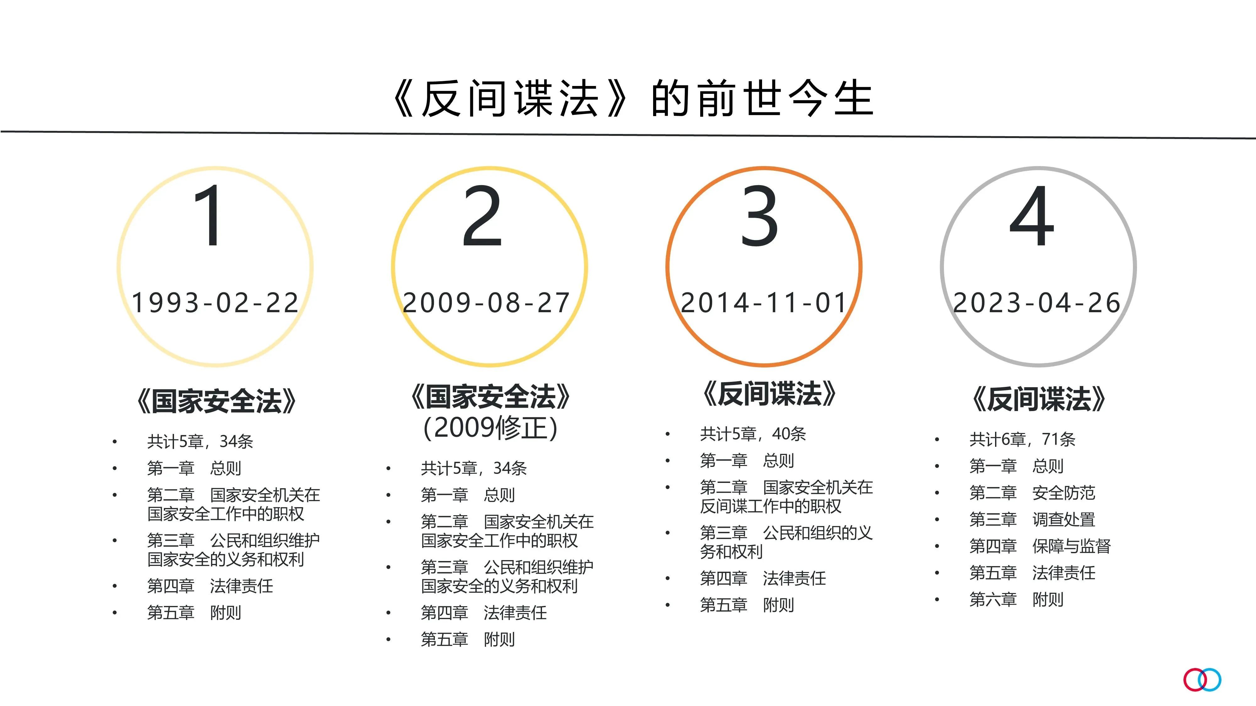 回答:首先,《反间谍法》的前身和基础是1993年公布实施的《国家安全法》[3],1993年《国家安全法》是以国家安全机关的反间谍工作为中心的国家安全立法,标志着国家安全机关的反间谍工作全面走上了法治化的轨道。该法在经历2009年修订后,于2014年被正式更名后的中国首部《反间谍法》所取代。2014年施行的《反间谍法》是我国贯彻落实总体国家安全观的第一部重要法律。本次《反间谍法》是对2014年《反间谍法》进行全面修订与完善的成果。具体而言,与2014年《反间谍法》相比,2023年《反间谍法》新增法条29条,修改41条,共计6章、71条。