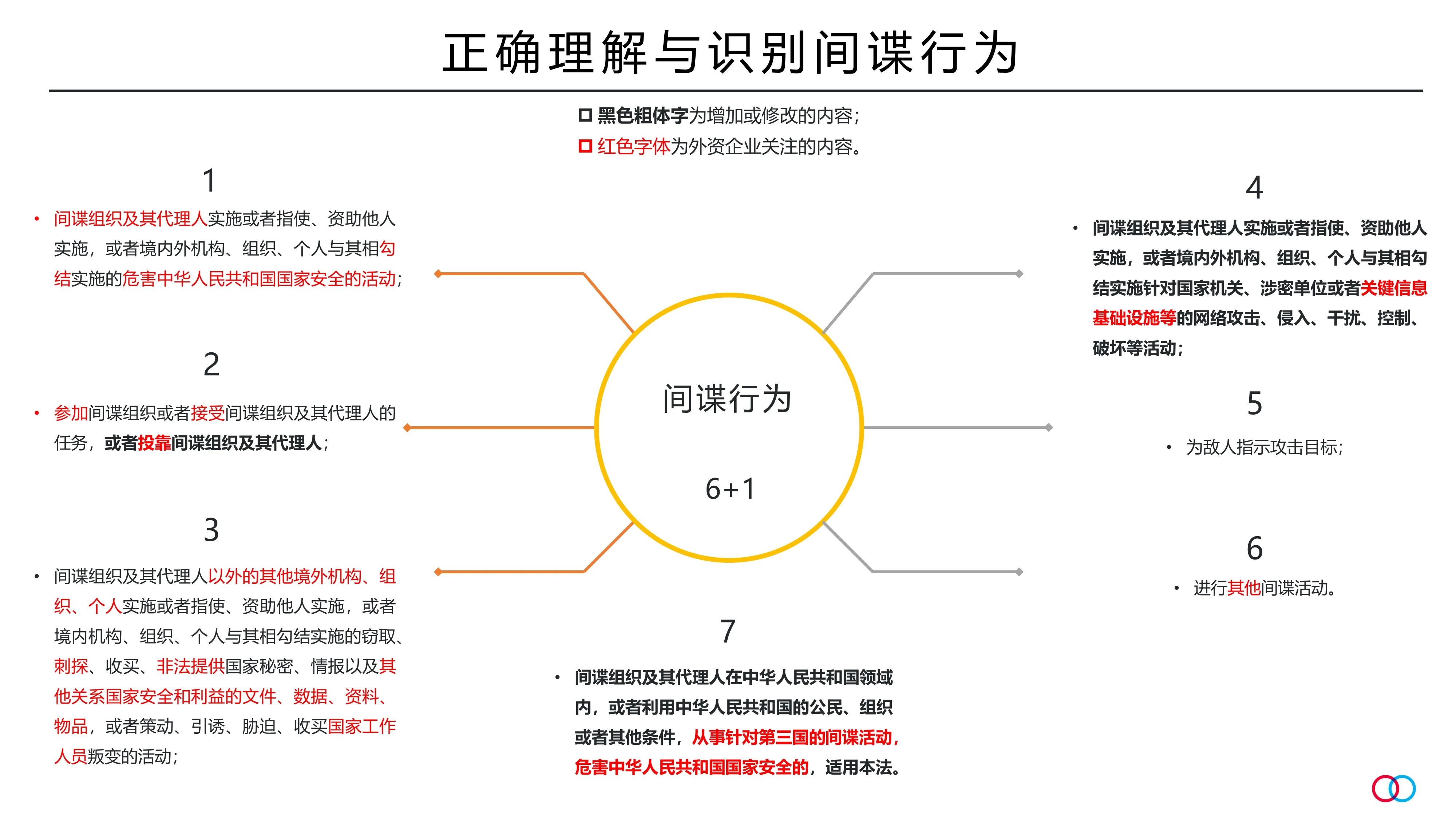 回答:首先,明确什么是间谍行为,是《反间谍法》本次修订最为核心的内容之一。以下图示中的黑色粗体字为2023年《反间谍法》第四条中新增或修改的内容,而红色字体则为近期外资企业较为集中关注的重点内容。