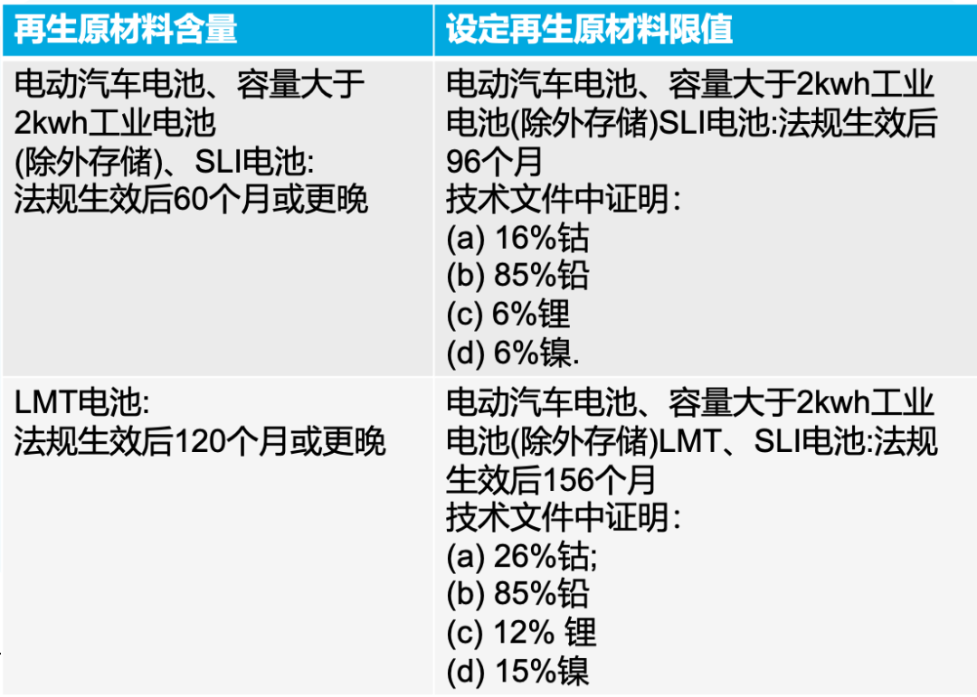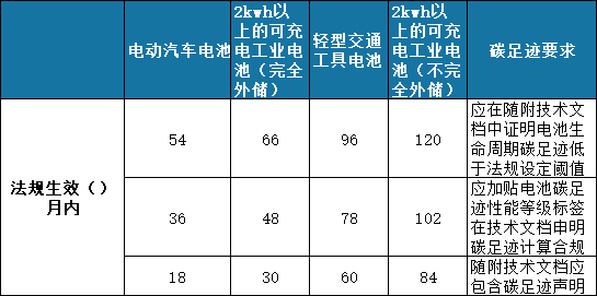 《新电池法》对碳足迹披露的要求如前文“一、(1)”中所述,建议企业根据电池用途、性能、原材料含量等进行分类,以确定碳足迹披露的时间节点。