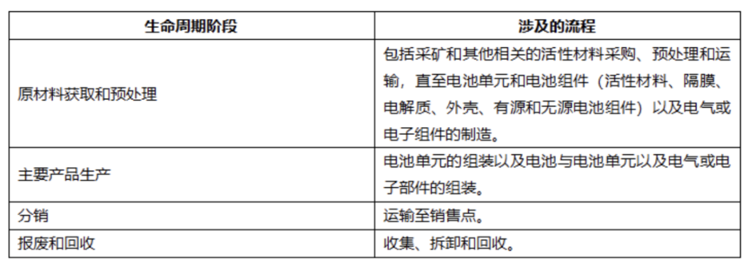 企业披露电池产品的碳足迹需要按照电池产品的生命周期阶段进行区分,即原材料获取和预处理、主要产品生产、分销、报废和回收阶段。碳足迹声明至少包含下列信息: