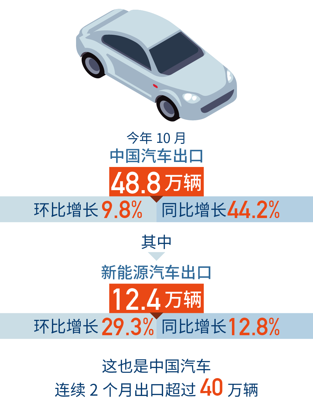 中汽协数据显示,分车型看,10月份中国乘用车出口42.1万辆,同比增长50.5%;商用车出口6.7万辆,同比增长14.5%。其中,传统燃油汽车出口36.4万辆,同比增长59.3%;新能源汽车出口12.4万辆,同比增长12.8%。纯电动汽车出口11.5万辆,同比增长13.8%;插混汽车出口0.9万辆,同比增长0.8%。