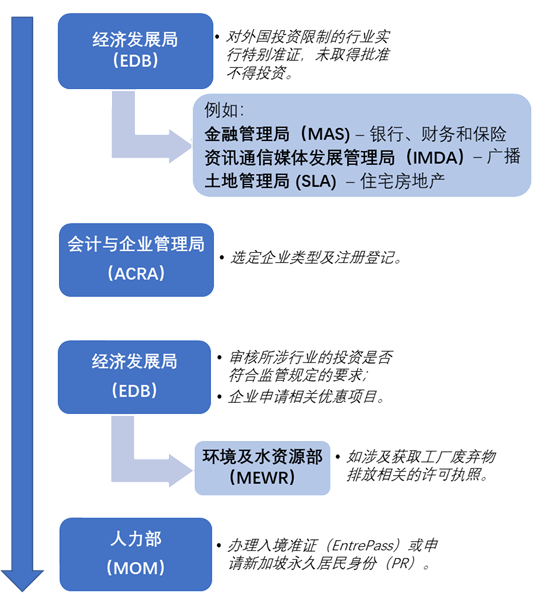 新加坡贸易和工业部(MTI)通常监督与贸易和投资有关的事项,新加坡与投资相关许可审批根据领域和性质由不同部门管辖。为便于读者可视化地了解投资新加坡时所涉及的主管机构和关键流程,以新设企业为例,我们制作了如下图表:
