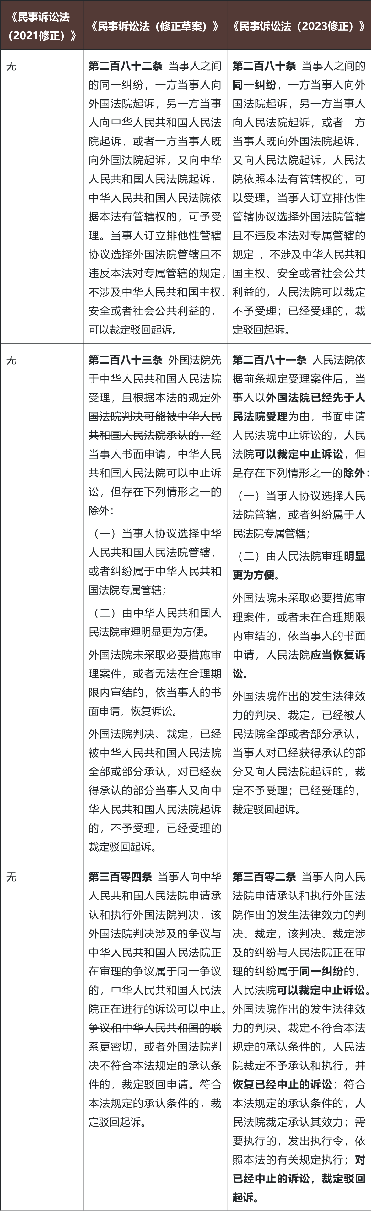 本次民诉法修改后的三个条文涉及的跨境平行诉讼受理、中止和恢复机制系新增制度,目的在于对境外司法管辖权适度礼让,避免因平行诉讼导致当事人之间的纠纷解决更加复杂。