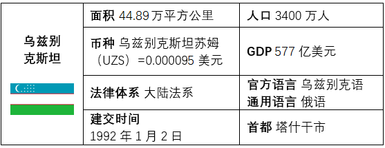 乌兹别克斯坦位于中亚腹地,是原苏联15个加盟共和国之一,首都塔什干市是中亚最大城市,人口数量是中亚五国之最。乌兹别克斯坦是中亚地区第二大经济体并且是中亚地区经济发展最快的国家,自然资源尤其是矿产资源丰富,总储量价值约为3.5万亿美元,现探明有近100种矿产品。乌兹别克斯坦主要盛产“四金”,即黄金、“白金(棉花)” 、“乌金(石油)”、“蓝金(天然气)”,其中金、铀、铜、岩盐与钾盐等储量位居世界前列,油气资源位居中亚前列。此外,乌兹别克斯坦拥有丰富的太阳能资源以及水电潜力。