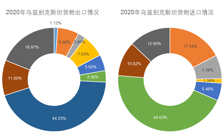 乌兹别克斯坦经济发展总体稳定,是传统的资源出口导向型经济体。中国是乌兹别克斯坦第一大贸易伙伴国和投资来源国,其他主要的贸易伙伴还包括俄罗斯、哈萨克斯坦、土耳其、韩国、德国等。2020年乌兹别克斯坦对外货物贸易出口额为131亿美元,进口额为200亿美元,主要进出口行业分布情况如下:
