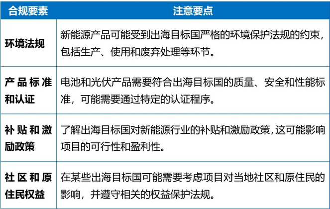 中国企业在新能源领域的快速发展和技术创新使其成为全球新能源产业的重要参与者,中国新能源领域中现有多家优秀出海企业在全球市场上具备强大的竞争力和影响力:例如宁德时代是全球最大的电池制造商之一,为全球新能源应用提供一流解决方案和服务,并在德国和匈牙利建立了生产基地。晶澳太阳能是全球光伏行业的领先企业,产品远销美国、日本、欧洲等多个国家和地区。隆基绿能是全球最大的单晶硅光伏产品制造商,其产品在全球市场上享有盛誉,并在越南、马来西亚布局了生产制造基地。就新能源行业而言,除了此前系列文章提及的注意要点外,我们提示出海企业亦需关注以下主要事项: