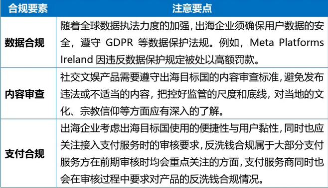 互联网行业早已是中国出海企业的热门行业之一,随着中国移动互联网技术的快速发展,许多中国的移动应用开始走向国际市场。例如,字节跳动短视频平台TikTok成功在全球范围内获得了巨大的用户基础,尤其是在年轻群体中极具影响力。欢聚集团旗下的直播平台BIGO LIVE在海外市场,特别是在东南亚、中东等地区取得了显著的成绩。雅乐科技的Yalla是一款面向中东市场的语音社交产品,通过提供符合当地文化习惯的社交体验,迅速获得了用户的青睐。就互联网(社交文娱类)而言,除了此前系列文章提及的注意要点外,我们提示出海企业需关注以下主要事项: