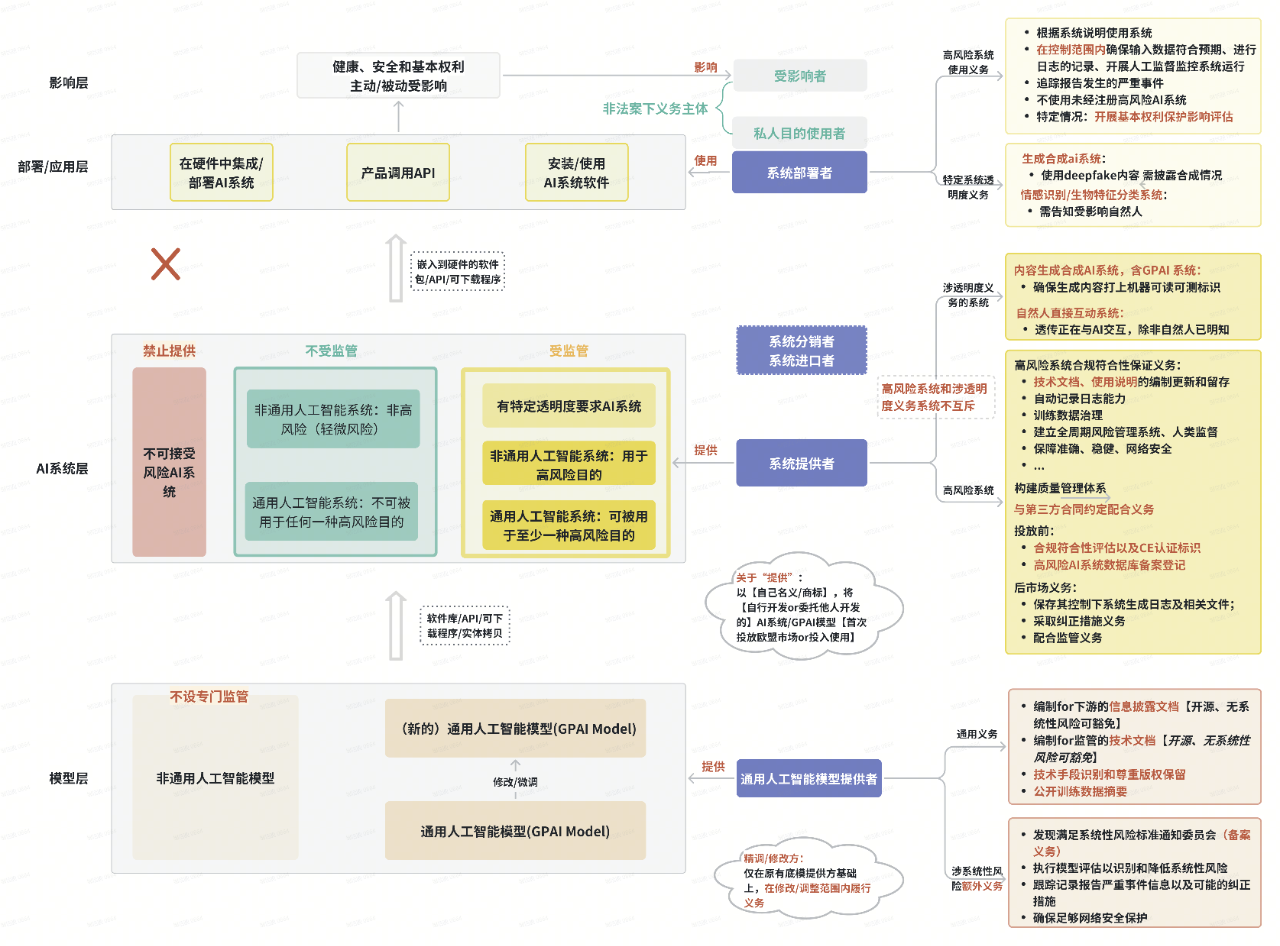 尽管AI法最终文本增加了对模型层(GPAI Models的)严格监管,但整体仍坚持并延续了基于风险的原则、识别不同风险影响程度设置相应监管要求: