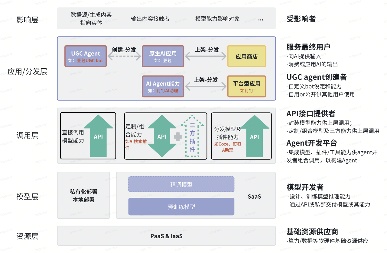 随着行业生态的发展,人工智能产业,尤其是生成式人工智能服务,其上下游参与主体日益复杂化,如我们整理的大模型应用生态视图所展示(图2),一款基于大语言模型的智能体/AI应用的服务链路从下至上涉及的参与方可能包括:基础模型推理能力/定制化模型能力API接口提供者、智能体开发平台(通常提供模型推理接口、外部插件、以及自定义知识库等定制/开发工具能力供开发者自行定义、开发AI系统/产品)、第三方插件/工具提供方、智能体(agent)开发者、智能体服务分发平台(平台型应用)等。在这样的模式下,从底层基础模型开始,链条中的每个环节参与者都不同程度参与或影响了终端服务的提供,可能成为“生成式人工智能服务提供者”,但任一单一上游主体和下游主体均无法全面了解、也无法完全控制整个 AI 系统。梳理出可以分配责任的主体类型并合理设置和分配责任是开展人工智能治理的关键,也是推动行业健康有序发展的现实需要。