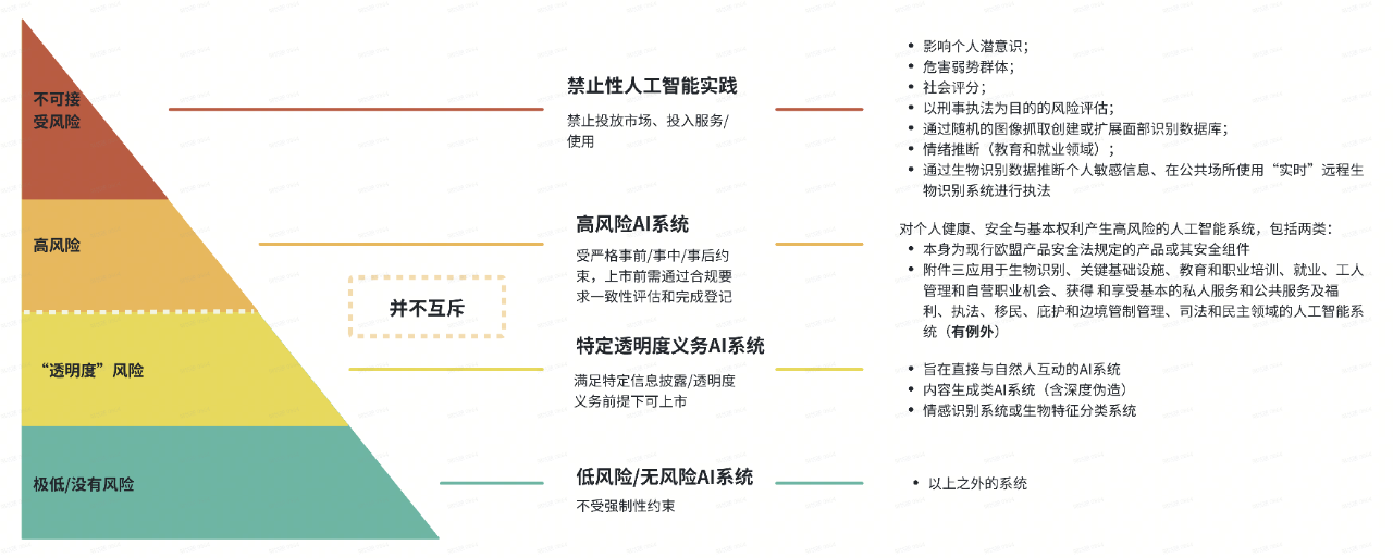从AI系统的应用场景/用途出发区分“不可接受风险”“高风险”等进行分级分类治理。具体而言: