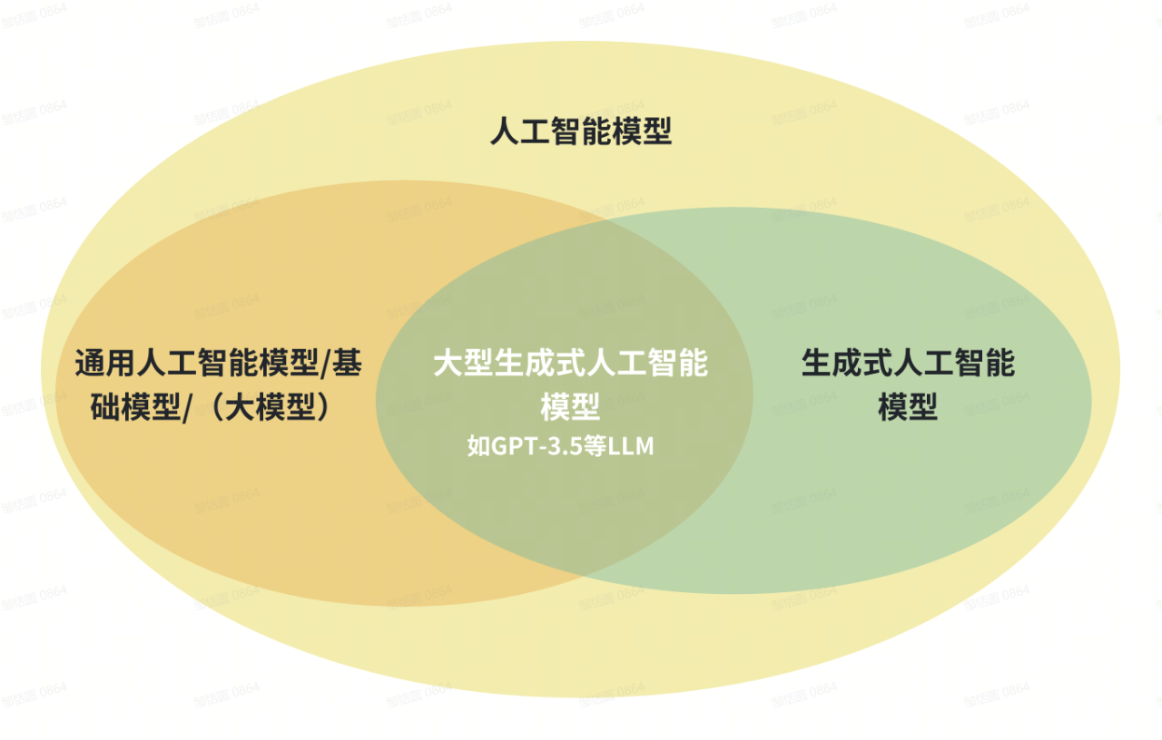 1. 从内涵上来看,通用人工智能模型、基础模型、生成式人工智能模型、大模型等概念范畴并不完全一致,互相之间关系见下方图2,