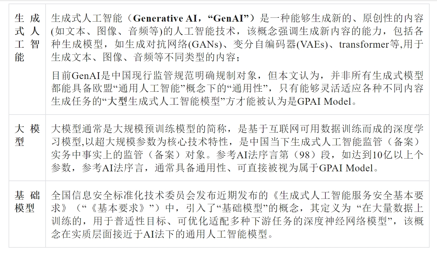 国内目前在法律和监管层面没有“通用人工智能模型”这一概念,更多被提及的相关概念为“生成式人工智能”、“大模型”、“基础模型”等,结合下方表格内对于三者相关情况介绍,本文认为: