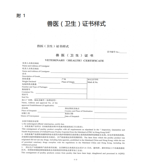 卫生证书:每批要对马来西亚出口的家禽或鸟类胴体、产品或其分割体必须在进口时随 附30日内签发的以下证书。