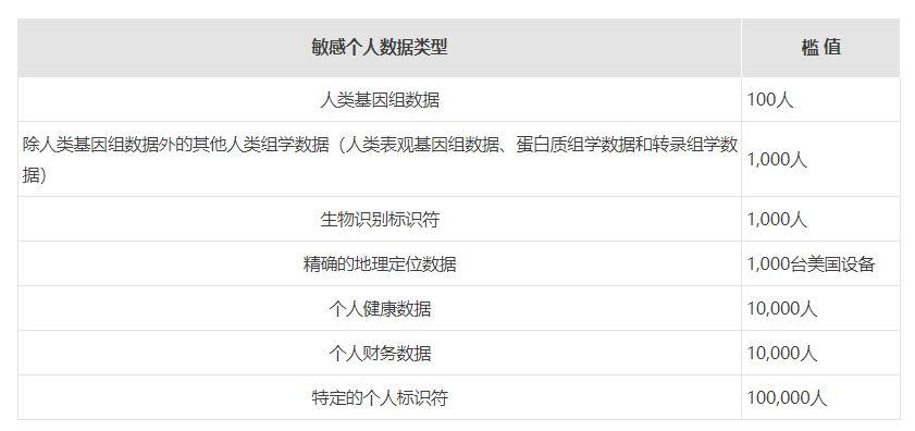 最终规则对于禁止或受限制交易中涉及的敏感个人数据的数量设置了具体的触发门槛阈值,具体而言:
