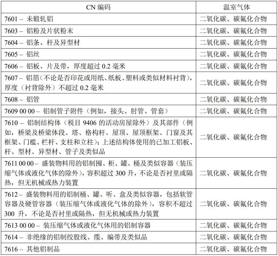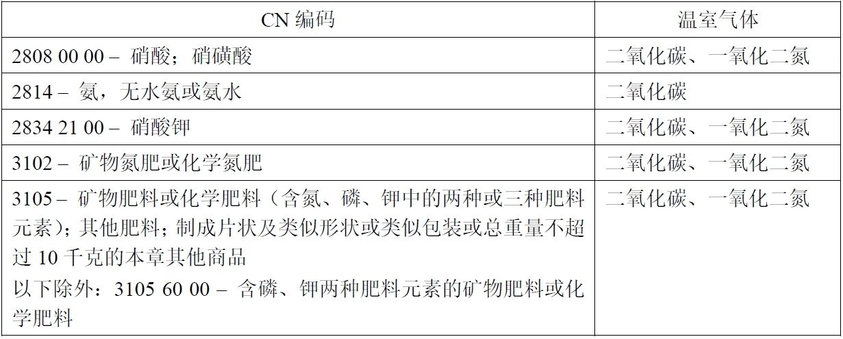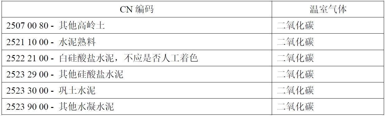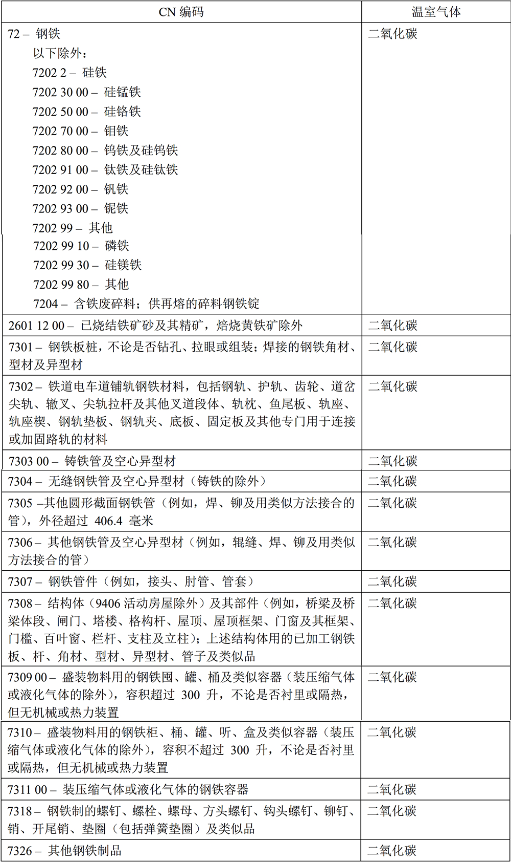 CBAM 条例附件1列示的CBAM商品以及与商品有关的温室气体列表如下(根据英文原文翻译,仅供参考):