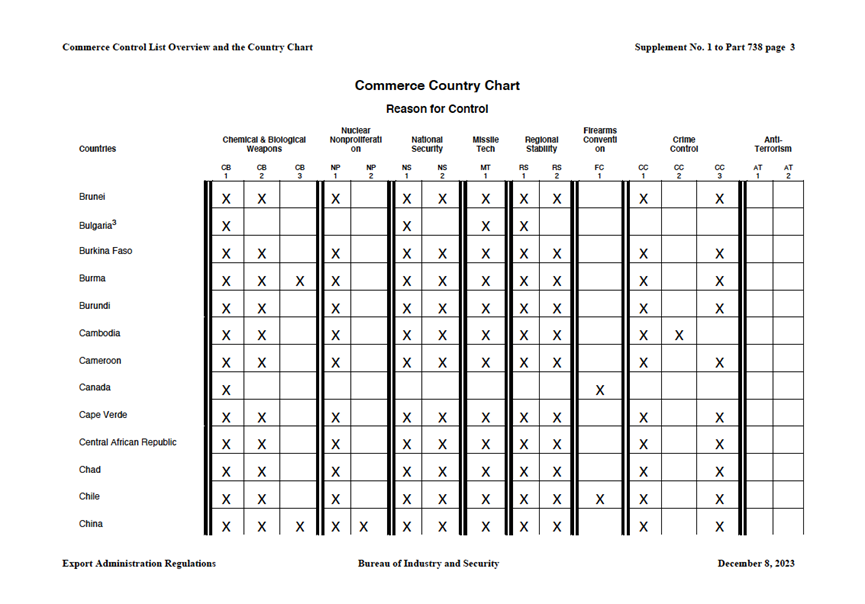 CCL详细列明了受管制物项的ECCN编码及其对应的管制理由。在明确某一受管制物项的管制原因后,需要结合CCC进一步确认是否需申请出口许可证。CCC的横轴代表管制原因,纵轴列示受管辖国家。通过在CCL中确定的管制原因与出口目的国(地区)进行匹配,若两者交汇处标记为“X”,则表示出口该物项需要许可证;若为空白,则无需许可证。