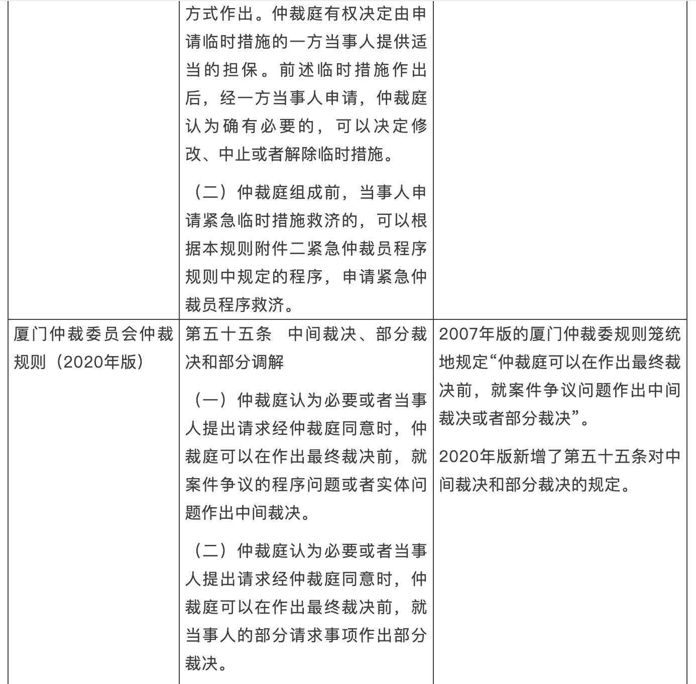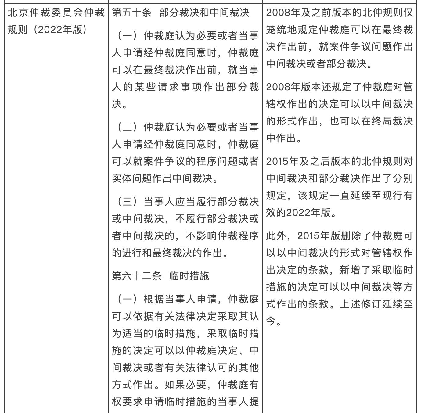 随着我国仲裁实践的发展,2014年修订的北仲规则开始明确区分部分裁决和中间裁决的概念。如今,贸仲、北仲、上国仲、上海仲裁委、厦门仲裁委等仲裁规则均就部分裁决和中间裁决在不同的条款中分别作出规定,下表中列举了我国部分仲裁机构的仲裁规则对于中间裁决和部分裁决的规定以及相关条款的历史沿革情况。