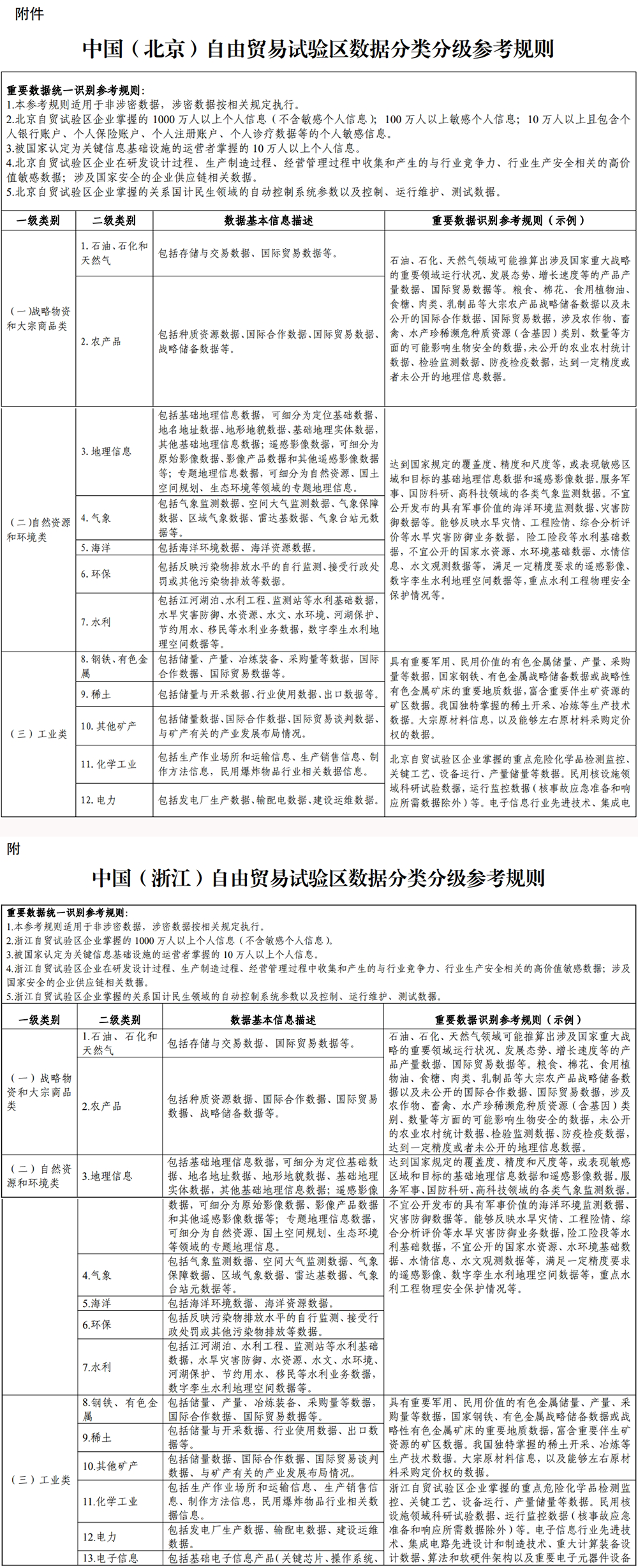 图3:北京与浙江自贸区重要数据统一识别参考规则及示例(部分截图)