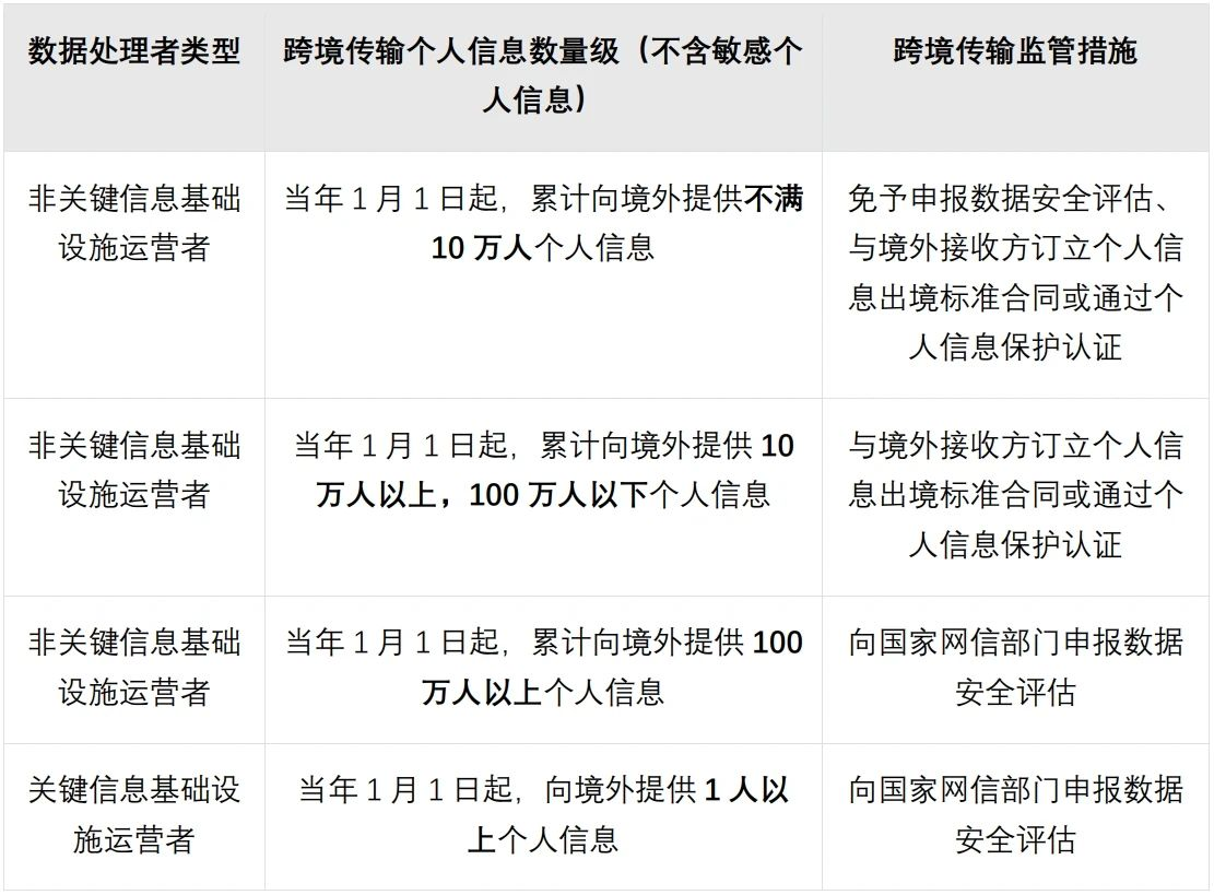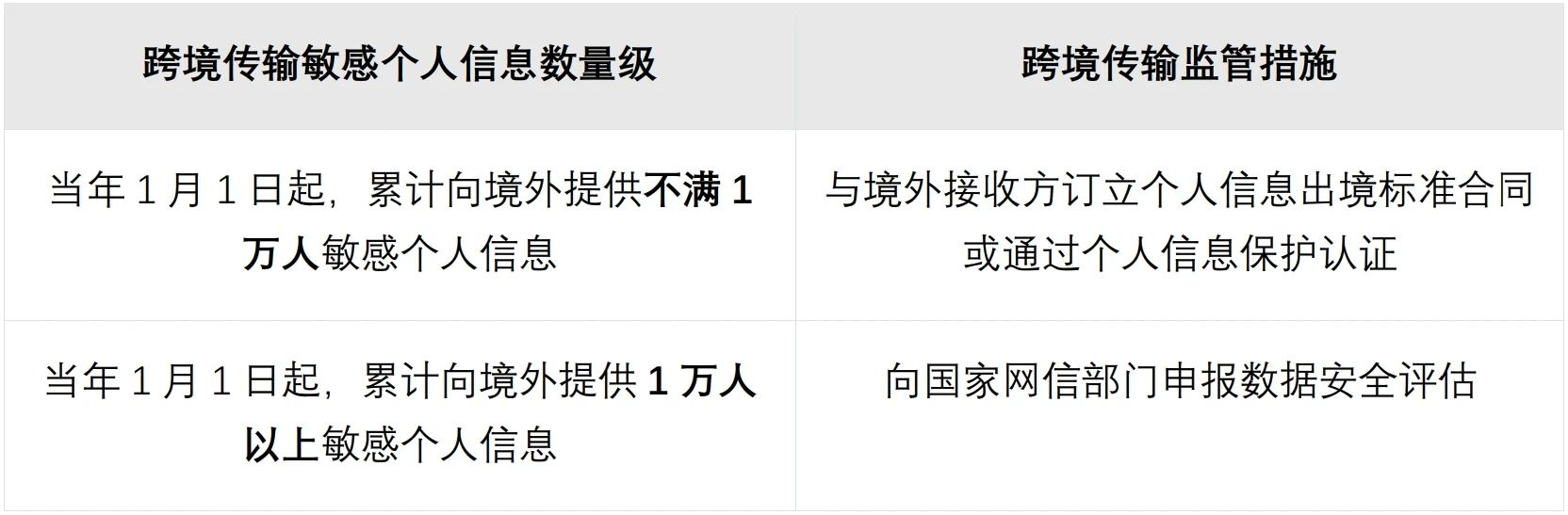 而针对敏感个人信息,由于其泄露对于当事人的人身安全和财产安全的风险性较高,即使泄露1人次,也可能产生严重法律风险。因此,对于敏感个人信息跨境传输监管不再区分数据处理者类型,而是根据传输敏感个人信息的数量级区分监管措施的严格程度。