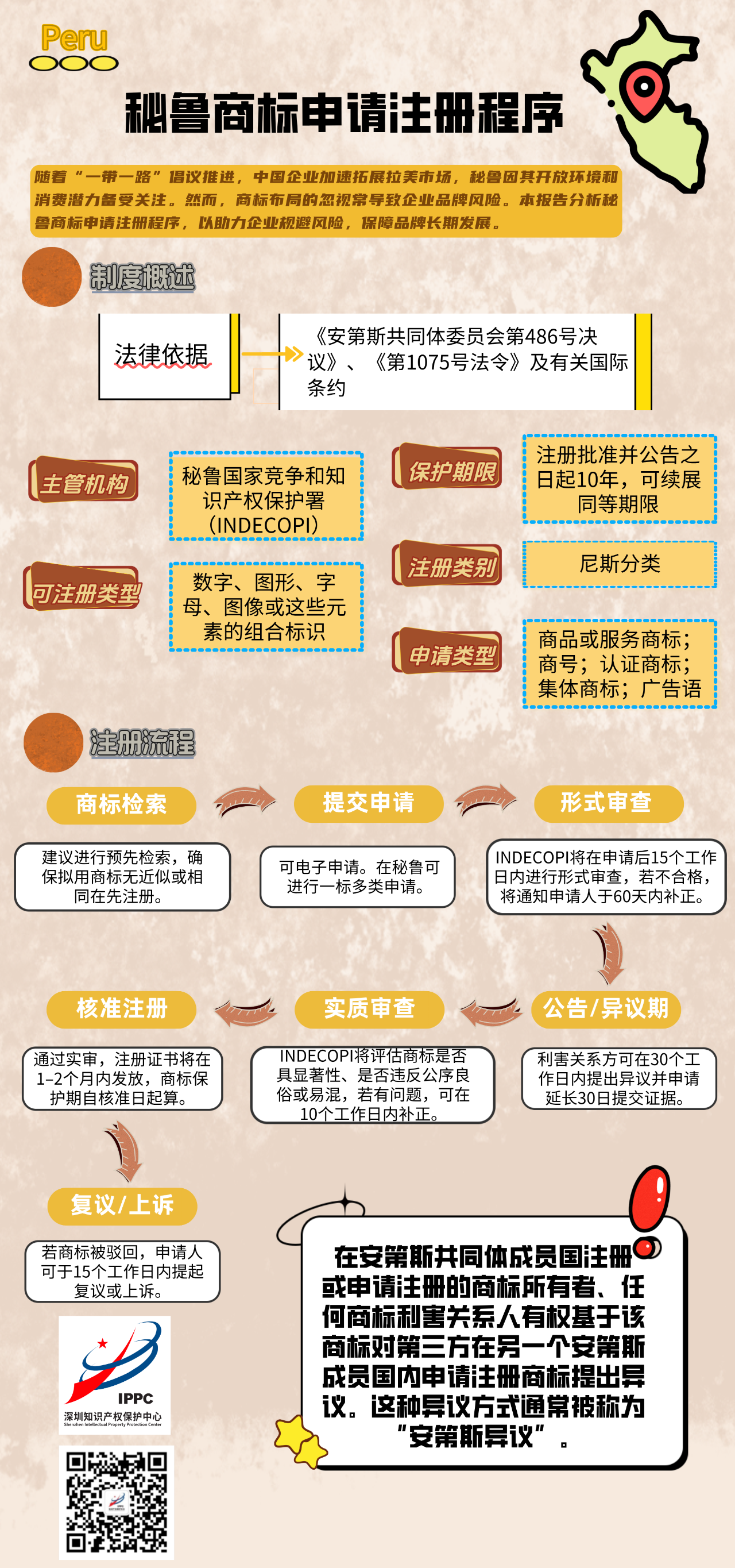 近年来,随着中国共建“一带一路”倡议的深入落实,企业拓展海外市场的步伐不断加快,拉美地区逐渐成为一个极具增长潜力的广阔市场。秘鲁作为拉美新兴经济体,其开放的市场环境与不断增长的消费需求吸引众多中国企业进入。然而,许多企业在开拓秘鲁市场过程中忽视了商标布局的前置性和战略性,导致品牌权益受损、法律风险增加。本报告对秘鲁商标注册制度进行系统分析,帮助企业提前规避潜在风险、助力品牌在当地的合法性与持续性运营。