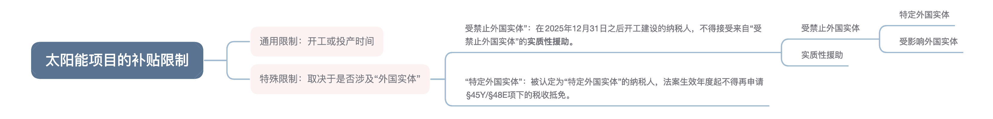 [2] “特定外国实体”相关限制:被认定为“特定外国实体”(Specified Foreign Entity,“SFE”)的纳税人,自法案生效年度起,将不再有资格申请 §45Y/§48E 项下的税收抵免。本条针对纳税人,即投资方,不直接针对光伏组件供应企业。
