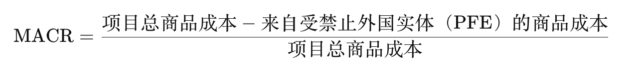 根据大而美法案,项目是否有资格申请关键能源类税收抵免,取决于其项目设施是否在商品或服务方面获得了来自受禁止外国实体(PFE)的“实质性援助”。实质性援助的判断标准为“实质性援助成本比率”(Material Assistance Cost Ratio,简称“MACR”),其计算公式为:用项目总商品成本减去来自受禁止外国实体(PFE)的商品成本,再将该差额除以总成本。项目需满足或超过特定的MACR门槛才能继续享有税收抵免资格,具体门槛因技术类型和建设年份而异。