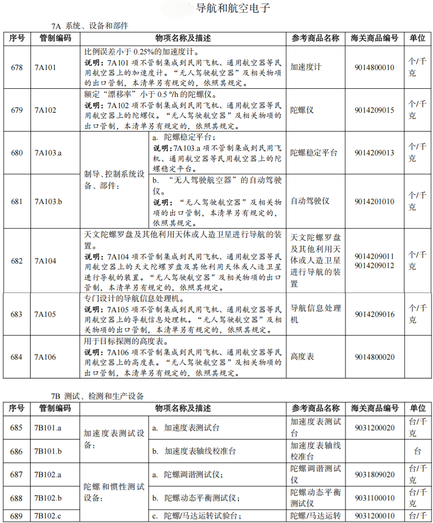 导航和航空电子类两用物项种类较多,但大多均有明确的管制清单编号及技术参数等商品属性,依据2025年度《两用物项和技术出口许可证管理目录》和《两用物项出口管制清单》的相关规定,具体如下: