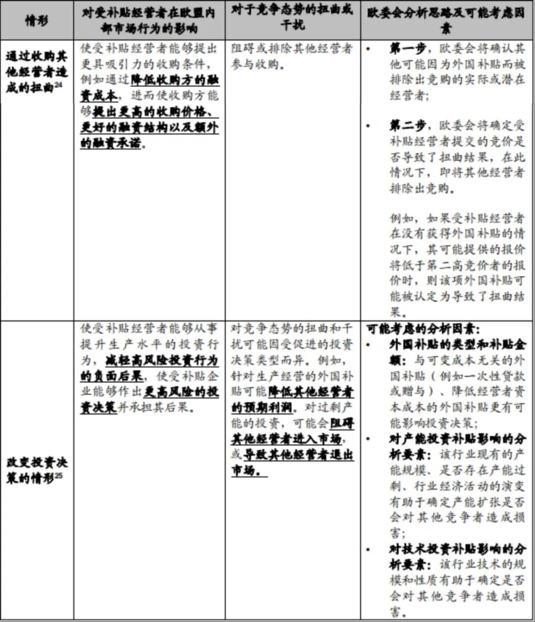 以“通过收购其他经营者造成的扭曲”以及“对受补贴经营者的投资决策的改变”为例,我们在下表中总结了在此情况下,外国补贴对受补贴经营者在欧盟内部市场行为的影响、对于竞争态势扭曲或干扰的表现形式,以及欧委会的分析思路及可能考虑的因素: