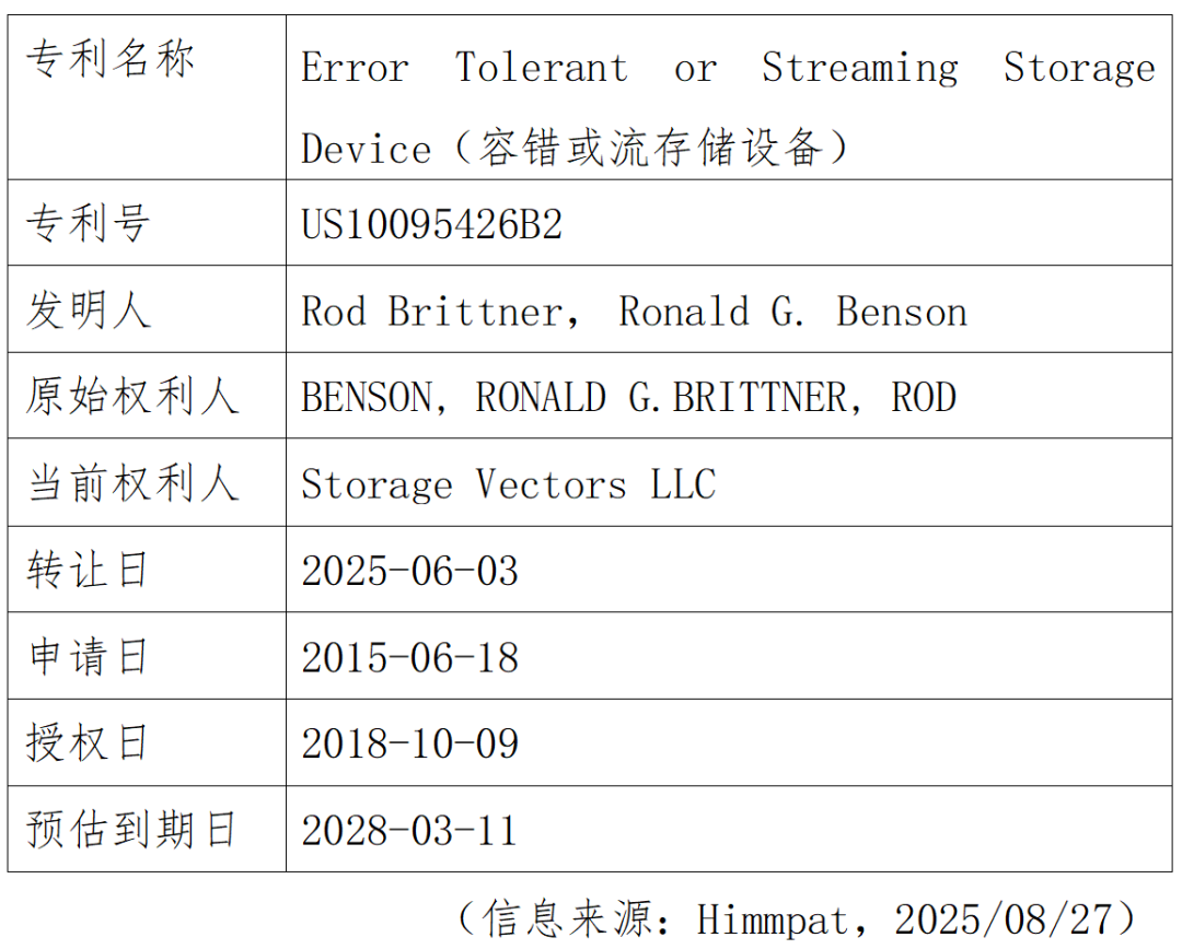 Storage是一家位于美国新墨西哥州的企业,2025年6月2日,涉案专利由原始权利人BENSON, RONALD G.BRITTNER, ROD转让给STREAMLINE DATA STORAGE, LLC,2025年6月3日再由STREAMLINE DATA STORAGE, LLC转让给Storage。经分析排查,Storage近期专注于专利诉讼,因此相关行业企业需警惕潜在的专利纠纷风险,本案原告的美国专利布局信息详见附件2。