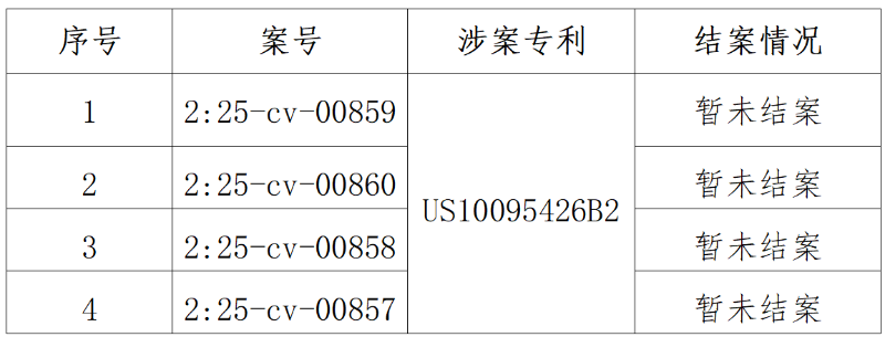 美国时间2025年8月25日,Storage在美国德克萨斯东区联邦地区法院分别针对深圳四家企业提起专利侵权诉讼(案号为:2:25-cv-00858、2:25-cv-00859、2:25-cv-00860、2:25-cv-00857),目前上述案件均处于送达过程中。