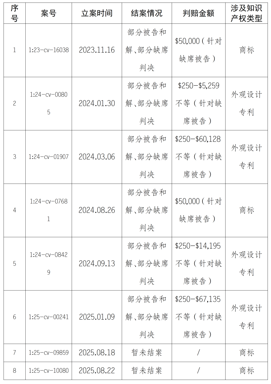 2023年至2025年9月,Deckers发起的93起美国联邦地区法院知识产权诉讼案件中,被告包含深圳企业的案件共8起,涉案深圳企业共8家,具体案件信息如下: