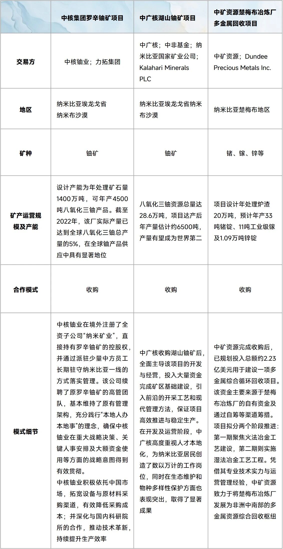 - 中核集团罗辛铀矿项目:罗辛铀矿是世界上运营历史最悠久的大型露天铀矿山之一。中核集团于2019年收购力拓集团持有的罗辛铀矿68.62%股权,2019年7月完成项目交接,并正式接管罗辛铀矿。中核集团接管后,积极引入新技术、新装备,产量连年创新高,还高效开展矿山延寿研究,重启了Z20勘探项目,将矿山寿命延长10年。罗辛铀矿每年保持约75%的本地化采购率,为当地创造了大量就业机会,还通过成立罗辛基金会,支持当地医疗、教育、体育等民生项目。