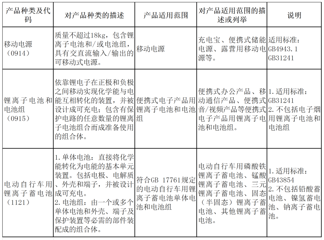 CCC认证不仅适用于我国国内生产、销售的相关产品,也适用于进口产品。现阶段,共有移动电源(0914)、锂离子电池和电池组(0915)、电动自行车用锂离子蓄电池(1121)等三类锂离子电池或含锂离子电池的电子产品被纳入CCC认证目录。其中,对电动自行车用锂离子蓄电池的CCC认证即将实施。