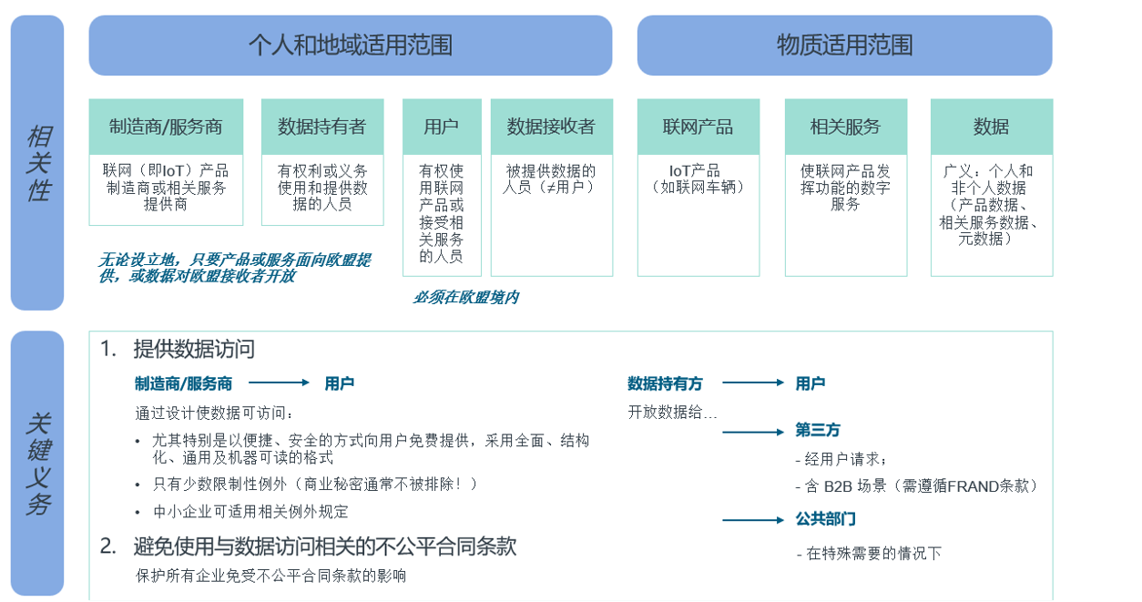 《数据法案》适用范围涵盖制造商、数据生成组件供应商、相关服务提供商、产品数据持有者,以及在欧盟市场从事产品销售、出租和租赁业务的主体,不受其设立地点限制。