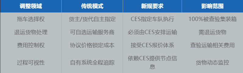 所有拖运任务将由查验场(CES)指定或关联的车队执行,即使是被判定需要退运的货物,也必须由查验场负责运输安排。这意味着,货物的运输安排将更多地依赖于查验场的调度和管理,进一步强化了查验场在货物运输流程中的主导地位。