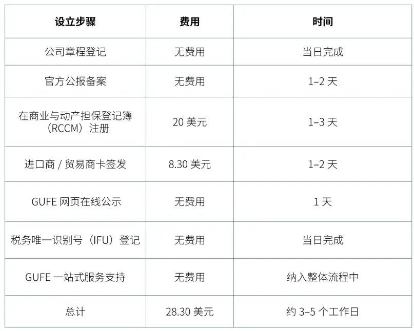 所有设立步骤均集中在企业注册一站式服务平台(GUFE, Guichet Unique de Formalisation des Entreprises),可在线完成,以实现对本地及外国投资者的程序简化。