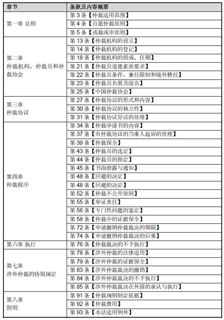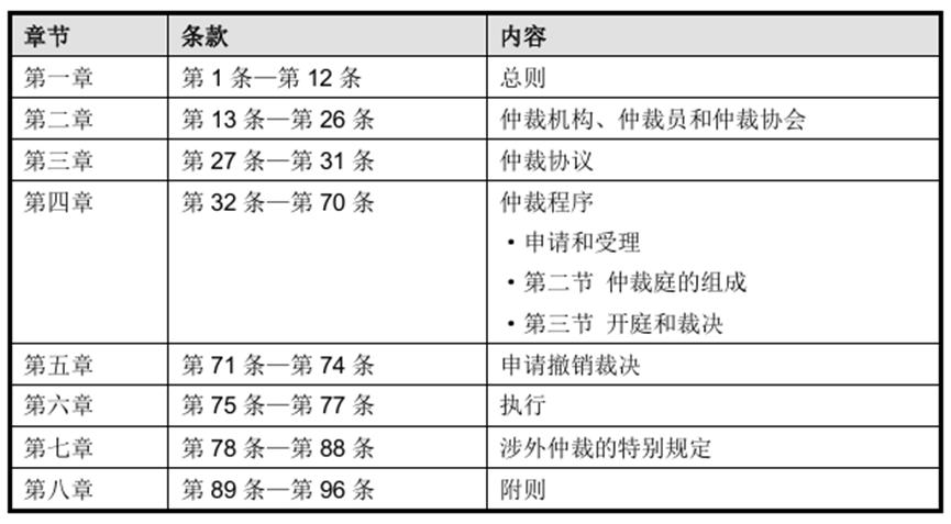 本次为《仲裁法》自1995年出台实施以来的一次全面修订,修订后的章节体例为8章96条,具体如下: