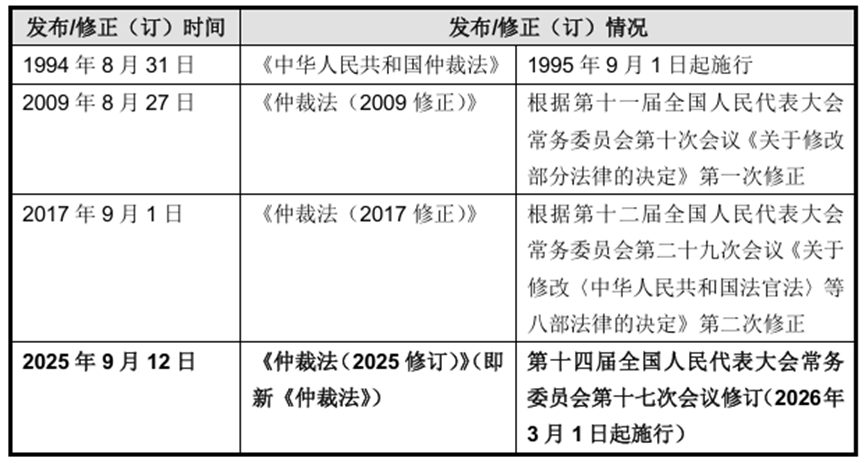 我国《仲裁法》于1994年8月31日发布,并于1995年9月1日起施行;经2009年8月27日第一次修正、2017年9月1日第二次修正后,于2025年9月12日进行了第一次全面修订: