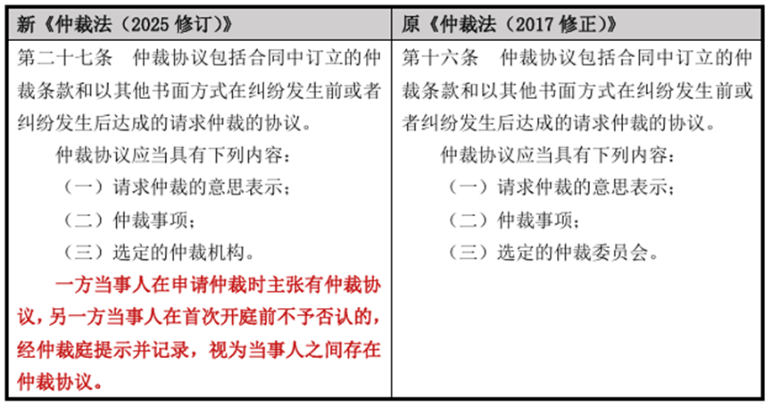 新《仲裁法》第27条,在原《仲裁法》16条规定的仲裁协议的形式和内容的基础上增加了“一方当事人在申请仲裁时主张有仲裁协议,另一方当事人在首次开庭前不予否认的,经仲裁庭提示并记录,视为当事人之间存在仲裁协议”,进一步扩大了仲裁协议的形式,更加尊重当事人的意思自治。在认定仲裁协议的形式上由原《仲裁法》仅认可书面方式的基础上,扩大到了也认可口头达成仲裁协议及默认仲裁的形式。也即,新《仲裁法》施行后,当事人申请仲裁时,即使没有书面的仲裁协议,但申请人若主张有仲裁协议,则仲裁庭也会受理。只要对方当事人在首次开庭前不予否认,且经仲裁庭提示并记录的,则视为当事人之间存在仲裁协议,即仲裁委有权管辖。