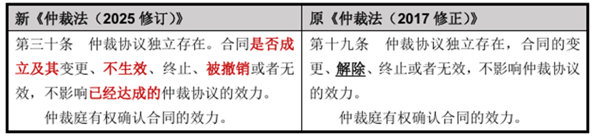 新《仲裁法》第30条进一步强化了“仲裁协议独立性”原则。一方面,在合同未成立、未生效或被撤销的情形下,司法实践一贯认定仲裁协议仍独立具有效力,本次修订是对这些司法经验的重申和固定;另一方面,该条款删除了合同“解除”的情形,这是因为修法过程中有常委委员提出,依照《民法典》规定,合同解除是合同终止的情形之一,二者不宜并列表述,故删除了“解除”。
