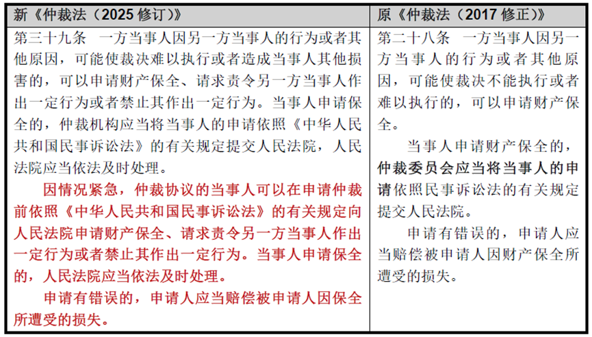 新《仲裁法》第39条在原《仲裁法》第28条规定的基础上,新增了行为保全“可以请求责令另一方当事人作出一定行为或者禁止其作出一定行为”以及“因情况紧急,仲裁协议的当事人可以在申请仲裁前依照民事诉讼法的有关规定向人民申请财产保全、行为保全。人民法院应当依法及时处理”,加强了与《民事诉讼法》的链接。也加强了人民法院对仲裁的支持力度。有利于仲裁协议当事人更好的维护其合法权利。新《仲裁法》的这一规定,使得当事人不再苦恼于此前一定要仲裁立案后,通过仲裁机构去向人民法院递交保全资料等会增加过程时间,从而贻误最佳保全时机的冗余程序。