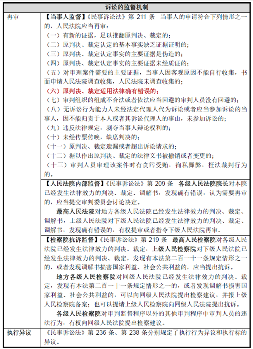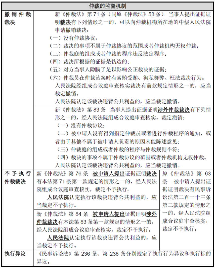 由上表可知新《仲裁法》下的监督机制有:撤销仲裁裁决、不予执行仲裁裁决以及执行异议。其中,申请撤销仲裁裁决的期限从原本的6个月缩短为3个月,进一步突出了仲裁高效的特点。诉讼的监督机制有:再审以及执行异议。其中再审又可以分为:依当事人申请的再审、检察院抗诉监督的再审以及人民法院内部监督的再审。
