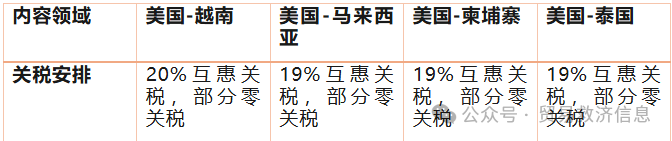 - 关税互惠:均采用美方维持固定关税(19%-20%),对部分产品零关税,东南亚国家大幅开放美国产品市场。