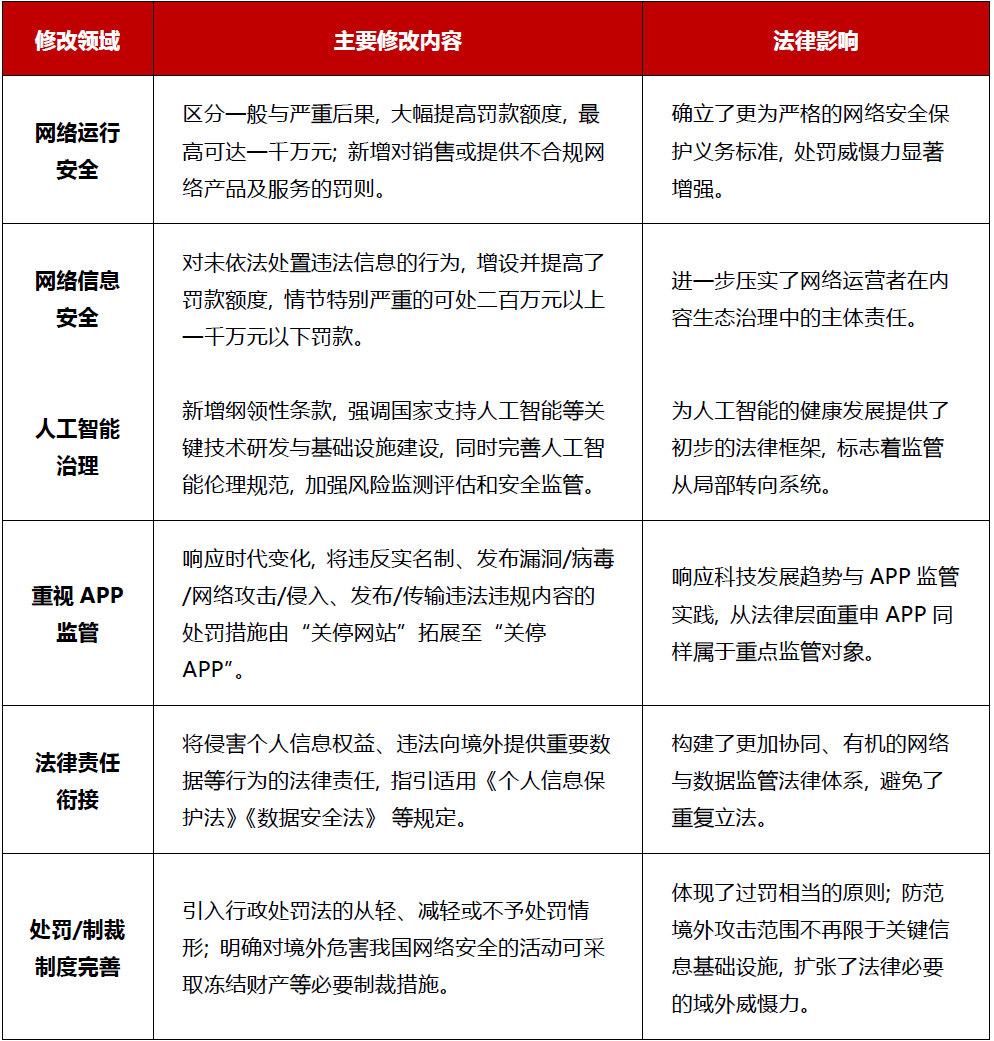 2025年10月28日, 《网络安全法》完成自2017年施行以来的首次重大修订, 并将于2026年1月1日起施行。本次修订虽以“小切口”方式聚焦法律责任制度, 但其变革深刻, 对企业的合规实践提出了更高要求。以下是对本次修订要点的梳理与评析。