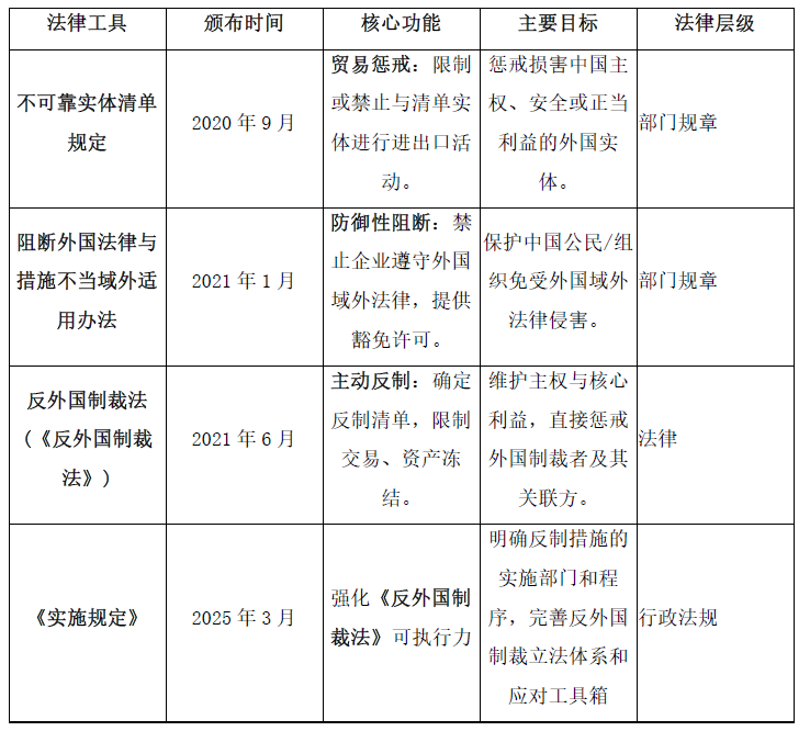 《反外国制裁法》的诞生标志着中国在应对外部风险挑战的法律策略上,完成了从被动外交抗议到主动法律体系防御的重大战略转型。该法旨在充实中国应对外部风险挑战的法律“工具箱”,提高相关法治水平,为此前中国通过行政手段实施的反制措施提供国家立法层面的支撑[3]。对于涉及跨境业务的众多企业而言,《反外国制裁法》的实施,连同其他反域外管辖法律工具,共同构建了一个复杂的“双重合规”环境。