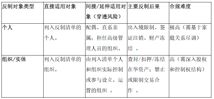 在《反外国制裁法》框架下,面临合规压力的企业群体呈现明确画像,同时需应对双重合规挑战。其中,跨境企业在华子公司及合资公司作为外国制裁者或其关联方在华资产的载体,最易成为反制清单目标;供应链涉及高科技或军民融合的企业,可能同时受到出口管制、不可靠实体清单与该法的交叉制约。而该法下最严峻的风险,在于第五条明确的反制措施延伸适用规则带来的关联实体影响与穿透式打击,国务院有关部门可对四类主体采取反制措施,包括列入反制清单个人的配偶和直系亲属、列入反制清单组织的高级管理人员或实际控制人、由清单个人担任高级管理人员的组织,以及由清单个人和组织实际控制或参与设立、运营的组织,这极大增加了企业合规尽职调查的难度与广度。这一条款的严厉之处在于其明确的穿透性。它涵盖了西方制裁体系中“次级制裁”[10]和“50%规则”[11]的精神,但又将其扩展到个人关系层面(配偶和直系亲属),以及对组织的实际控制和运营参与度。