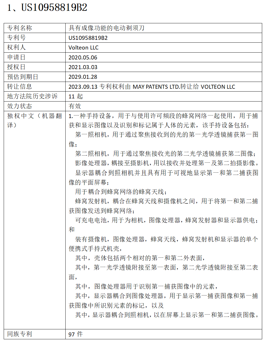 本次被诉产品为手持式智能手机,涉及手机的摄像头装置和内置感应加速度的配置,主要销售渠道为美国亚马逊。需注意的是,原告主张的'819专利主题名称虽为“具有成像功能的电动剃须刀”,但该专利的保护范围并非局限于电动剃须刀,而是包括了与蜂窝网络一起使用,且能捕获、显示图像以及识别和标记人体元素的手持设备。