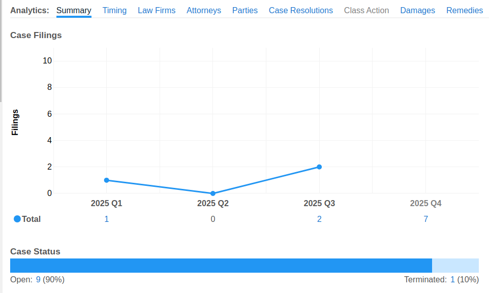 从2025年起,Netmomentum作为原告在美国地方法院持续发起诉讼共10起,均为专利相关诉讼且涉案专利一致。90%案件集中在美国德克萨斯州东区联邦地区法院起诉。其中,原告和解案件占10%,暂未结案案件占90%。